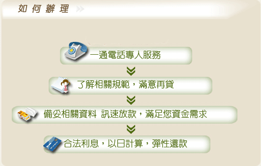 1.還款期數:最低3期 - 最長60期(以月計算) 2.年利率:百分之十12起,最高年利百分之30 3.無任何代辦手續費 4.依據個人工作,薪水其中各項負債授信條件不同,而有所差異 5.借貸成本計算的參考案例:假設貸款一筆新台幣300,000元的款項,還款期為60個月,總費用年百分之12,等於每月還款額度應為新台幣5,600元,而總還款額則為新台幣336,000元。